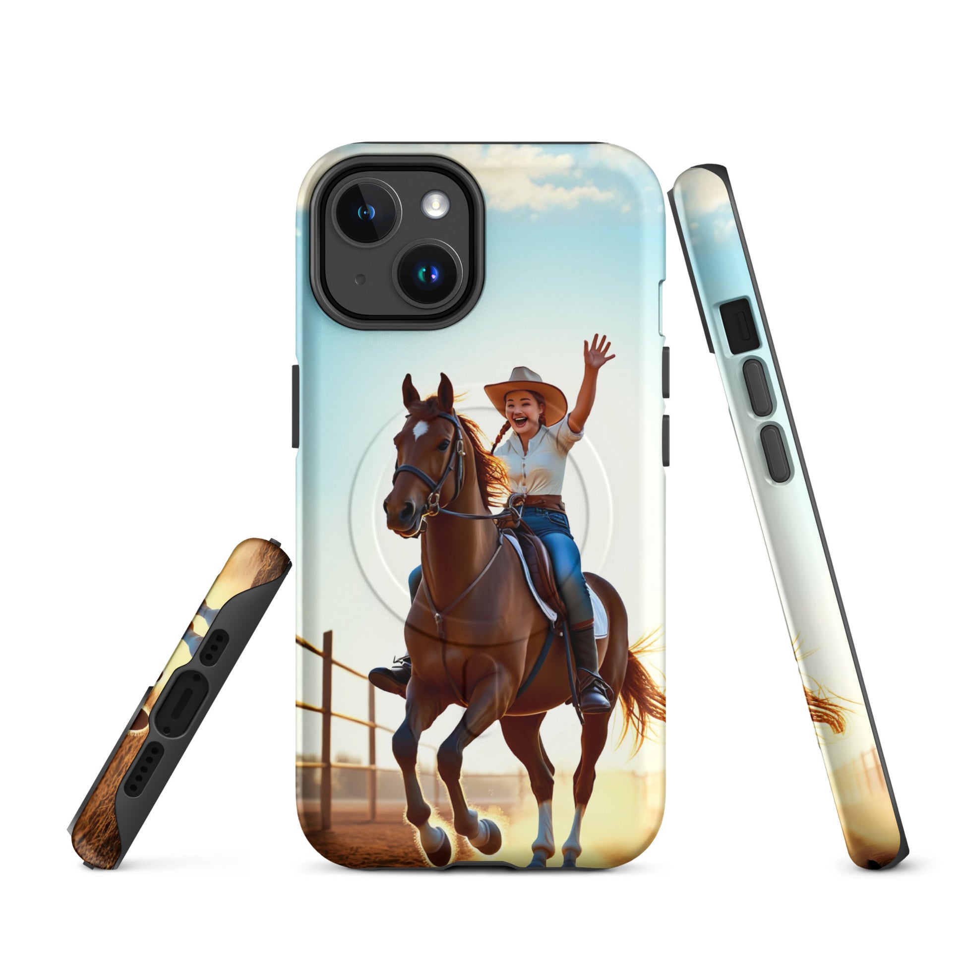 Awesome Western phone case featuring a happy cowgirl on her horse.