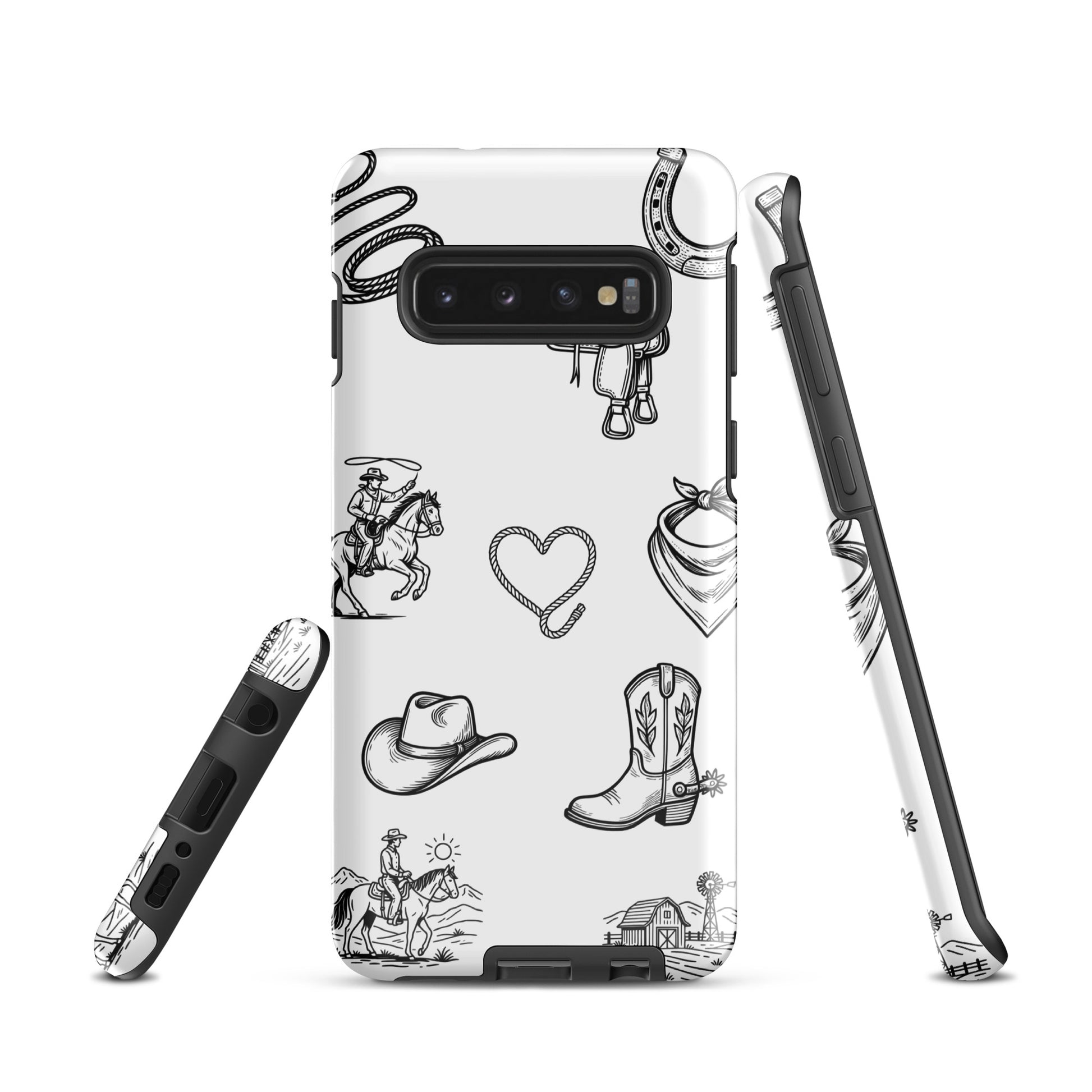 Western iconic imagery features on this quality phone case with a white background. Make your phone look like a work of art with this tough yet sleek phone case.