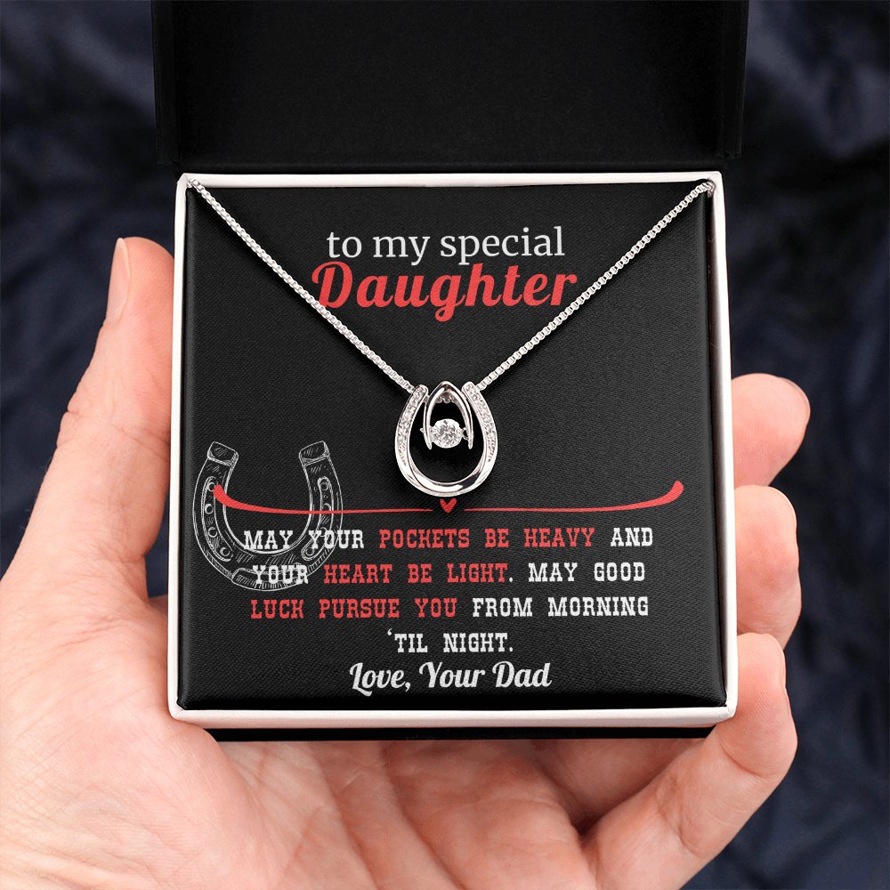 A Lucky Necklace for a Special Daughter with a message - "May your pockets be heavy and your heart be light. May good luck pursue you from morning ‘til night. Love, Your Dad."
